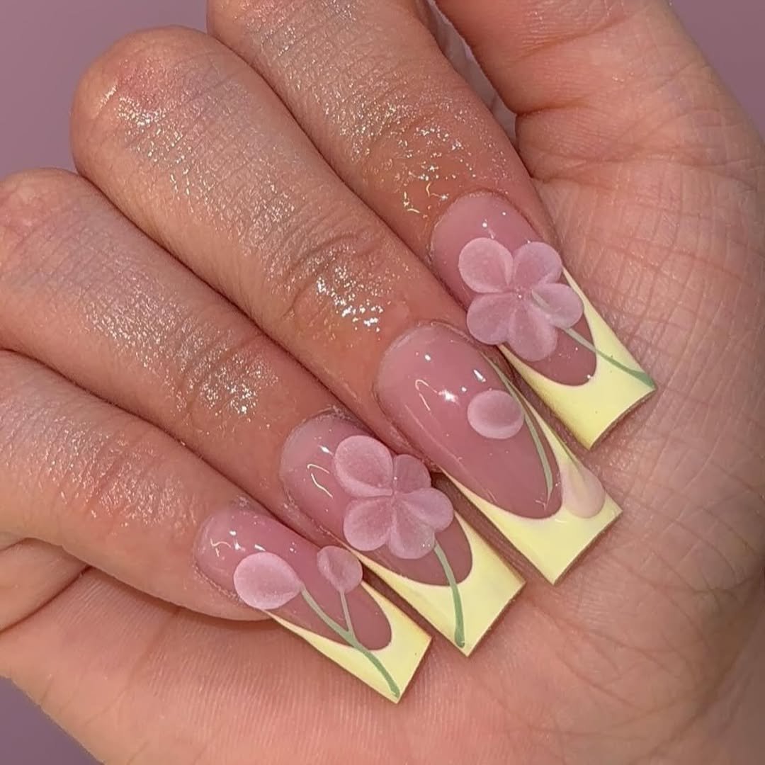 These nails are pure spring romance. The soft blush base melts into buttery yellow tips, and then those sculpted pink flowers step in like the main character of the whole look.