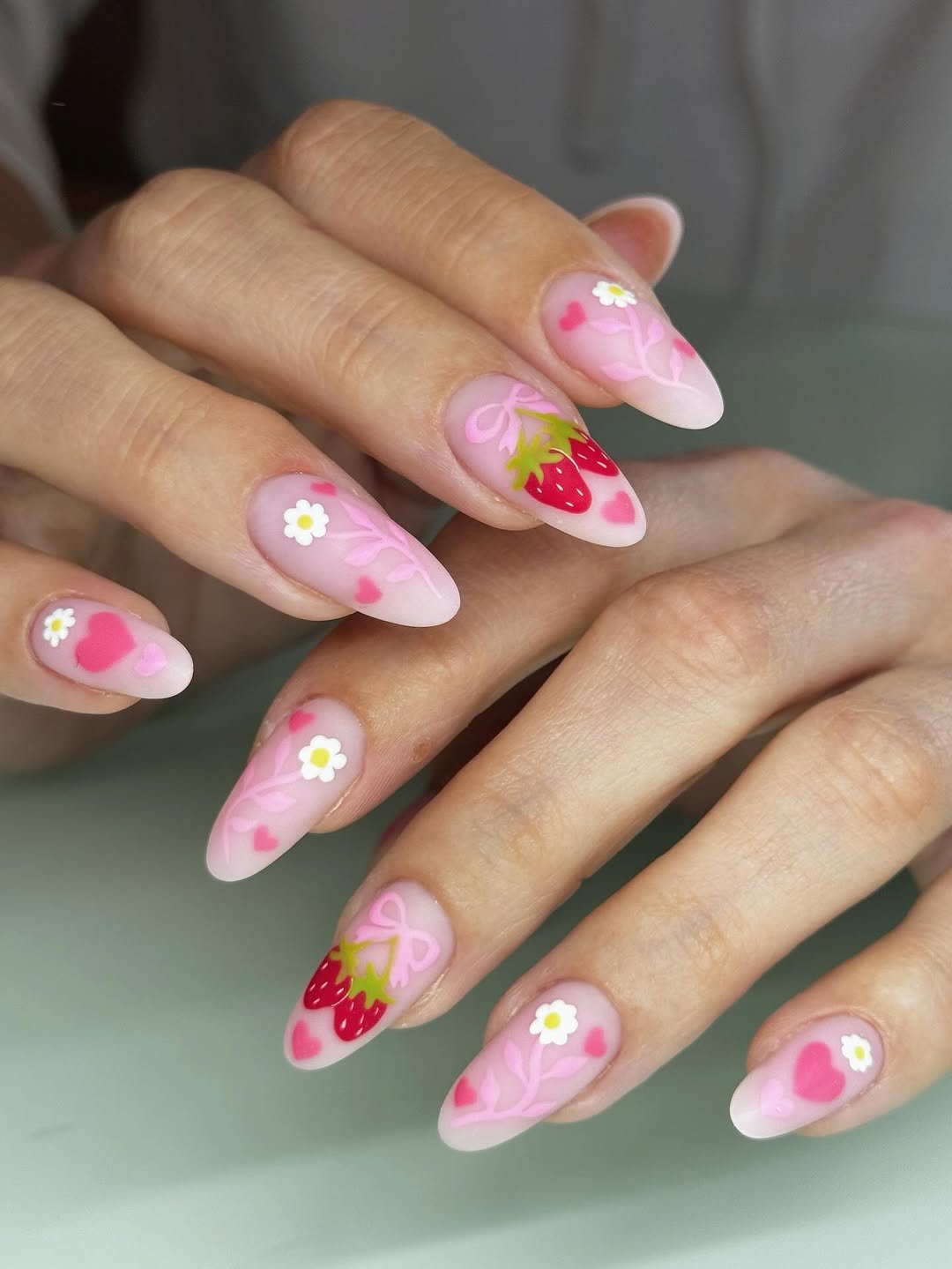 These nails look like they belong in a candy-colored daydream. Tiny hearts, miniature daisies, and bright red strawberries pop against a soft pink base, giving the whole design a playful, romantic feel.