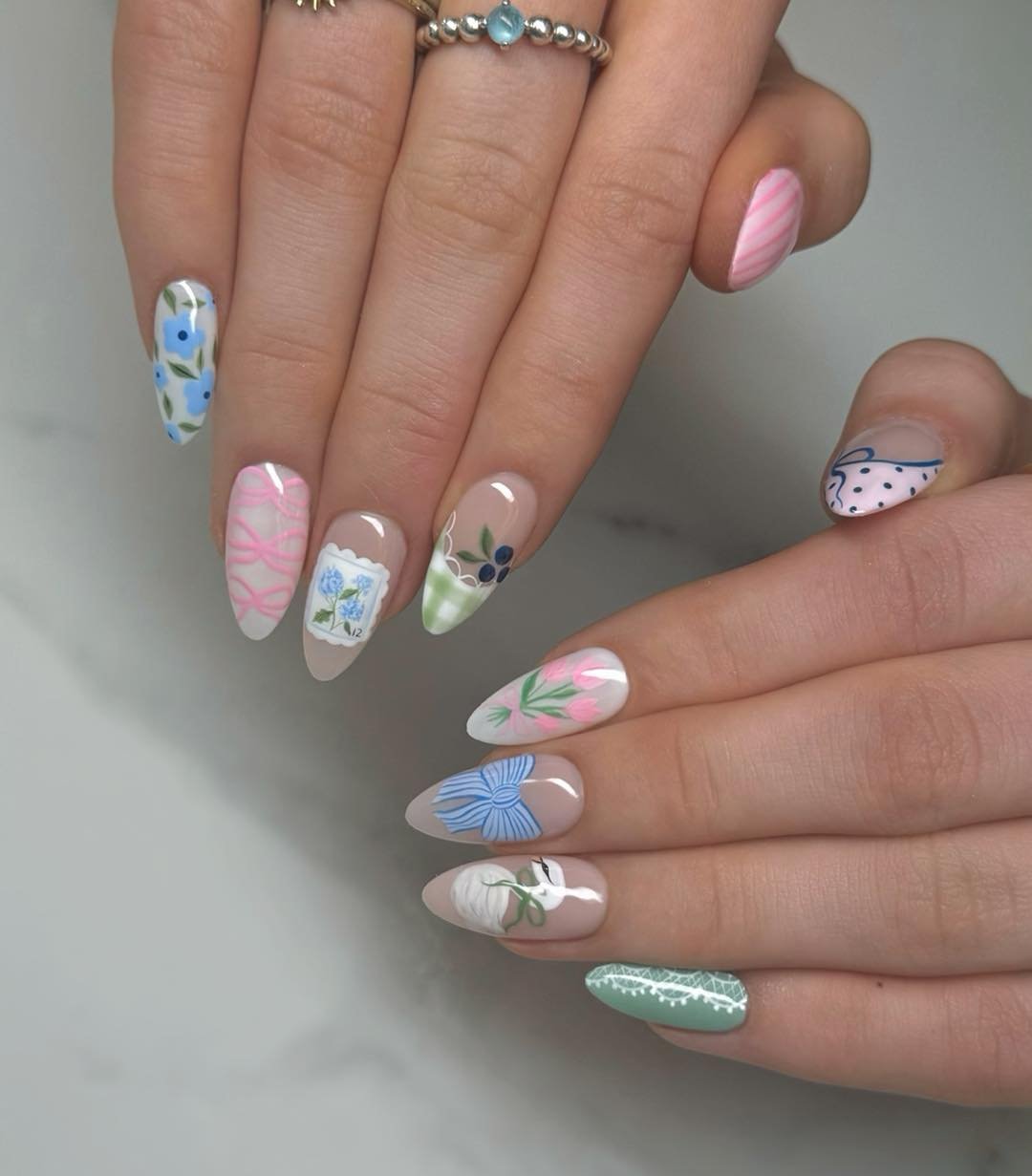 These nails look like a tiny scrapbook of springtime moments. Each nail brings a different pattern, from soft florals to gingham tips and ribbon-inspired designs, creating a charming mix that feels playful and creative.