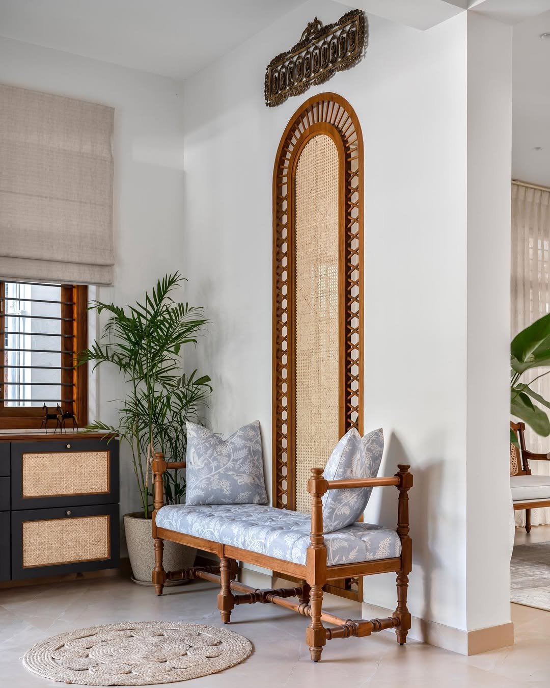 This corner feels calm in the best way. The cane textures, curved lines, and muted palette create a space that feels grounded and easy to settle into.