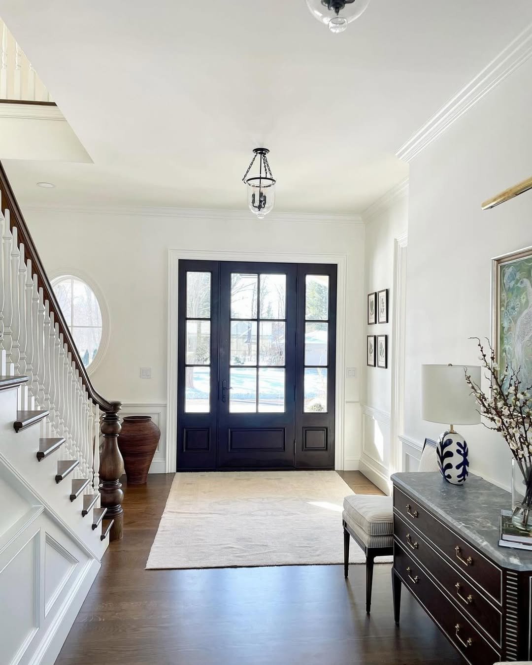 There’s something instantly calming about this entry. Soft white walls, a deep-toned door, and just enough contrast in the wood flooring to ground it all.