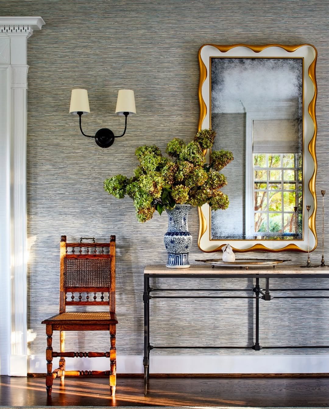 This entry leans into texture and history. The woven wall covering, ornate mirror, and antique chair create a mix that feels rich without being heavy.
