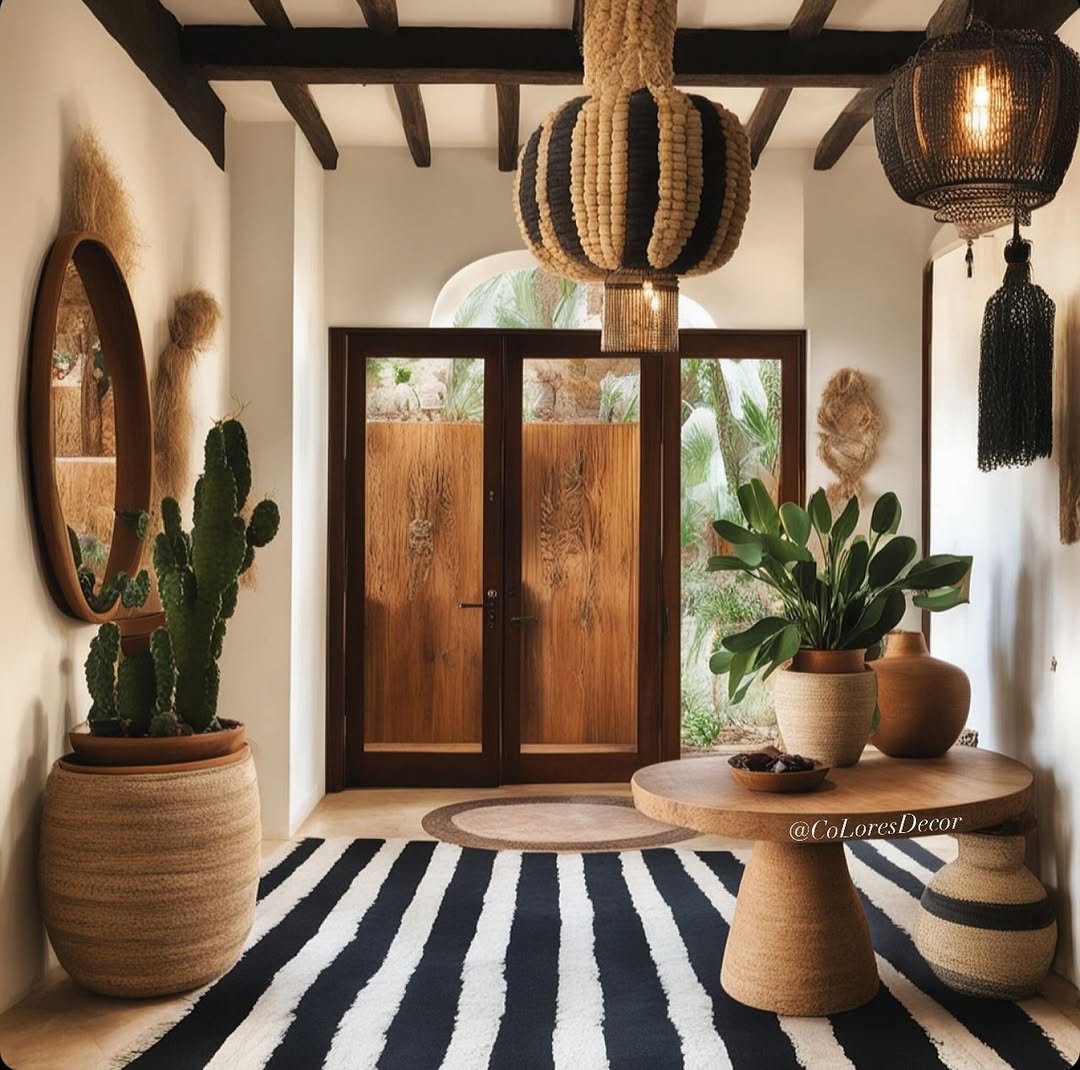 Sunlight, texture, and natural materials come together here in the most relaxed way. The woven pendants, striped rug, and sculptural plants give the space a grounded, easy rhythm.