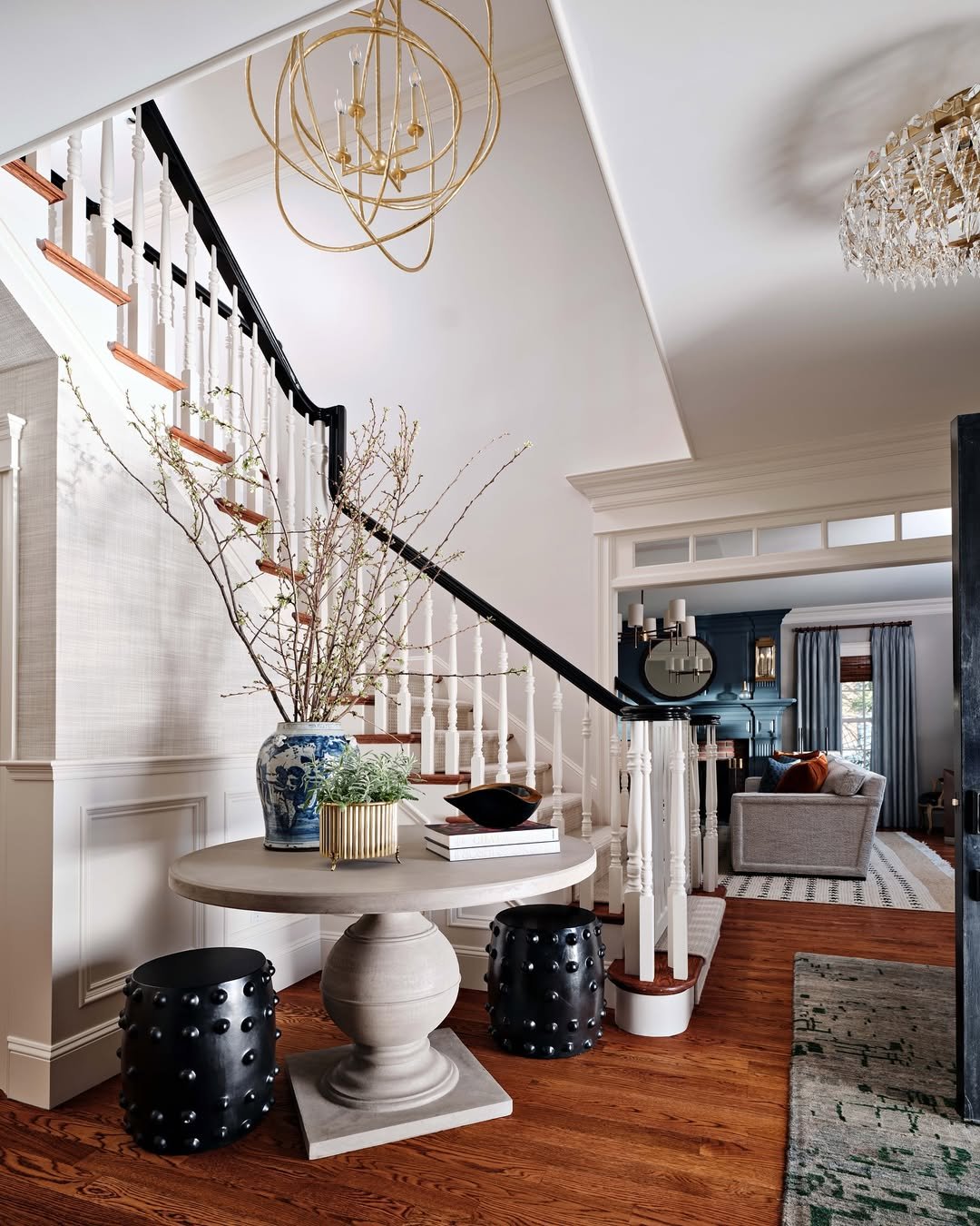 This space knows how to make an entrance. The sweeping staircase, layered lighting, and that perfectly placed round table give it a sense of movement and balance.