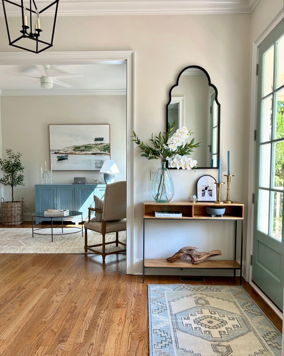 This foyer feels like a breath of fresh air. Pale wood floors, soft blues, and that sculpted mirror create a look that’s relaxed but still refined.