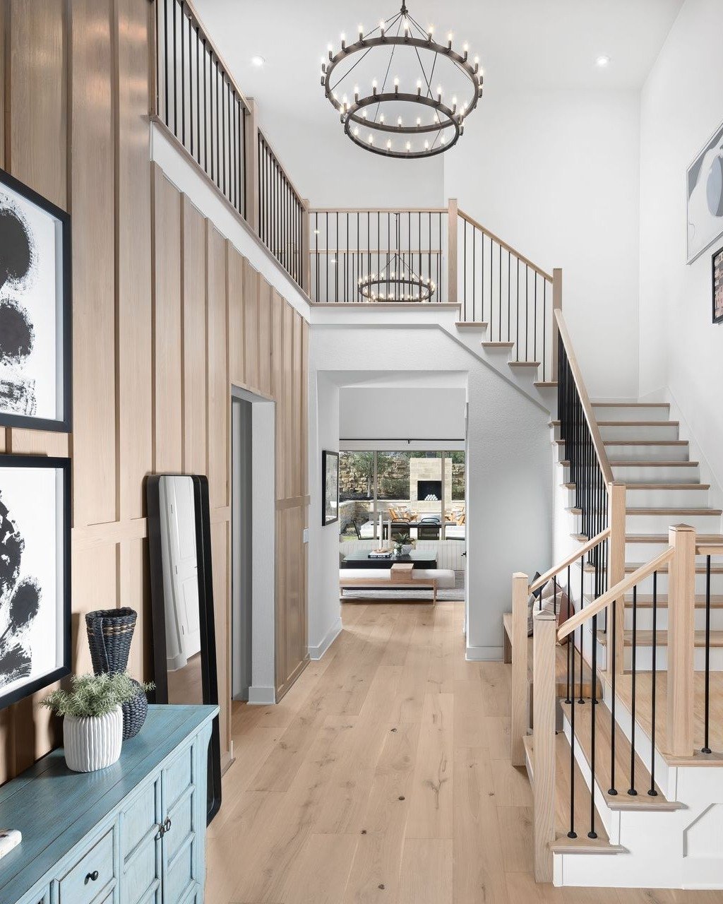 This one leans clean and architectural. The vertical paneling, open staircase, and soft wood tones give the space structure without making it feel heavy.