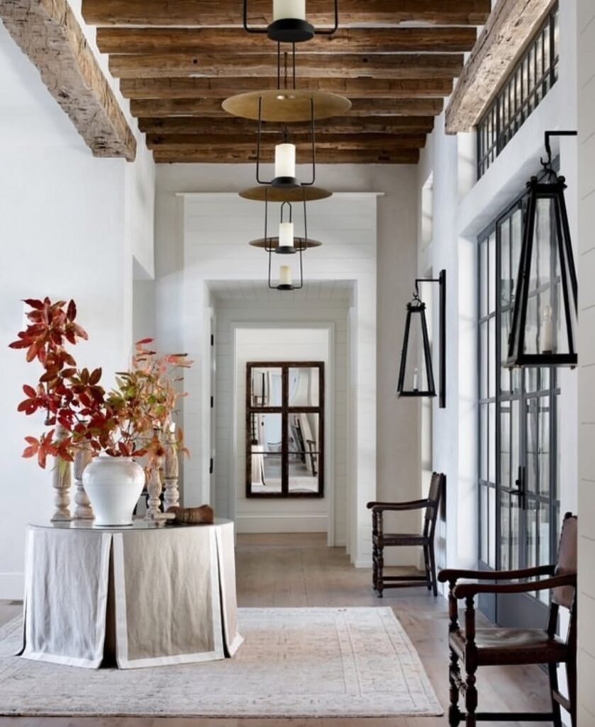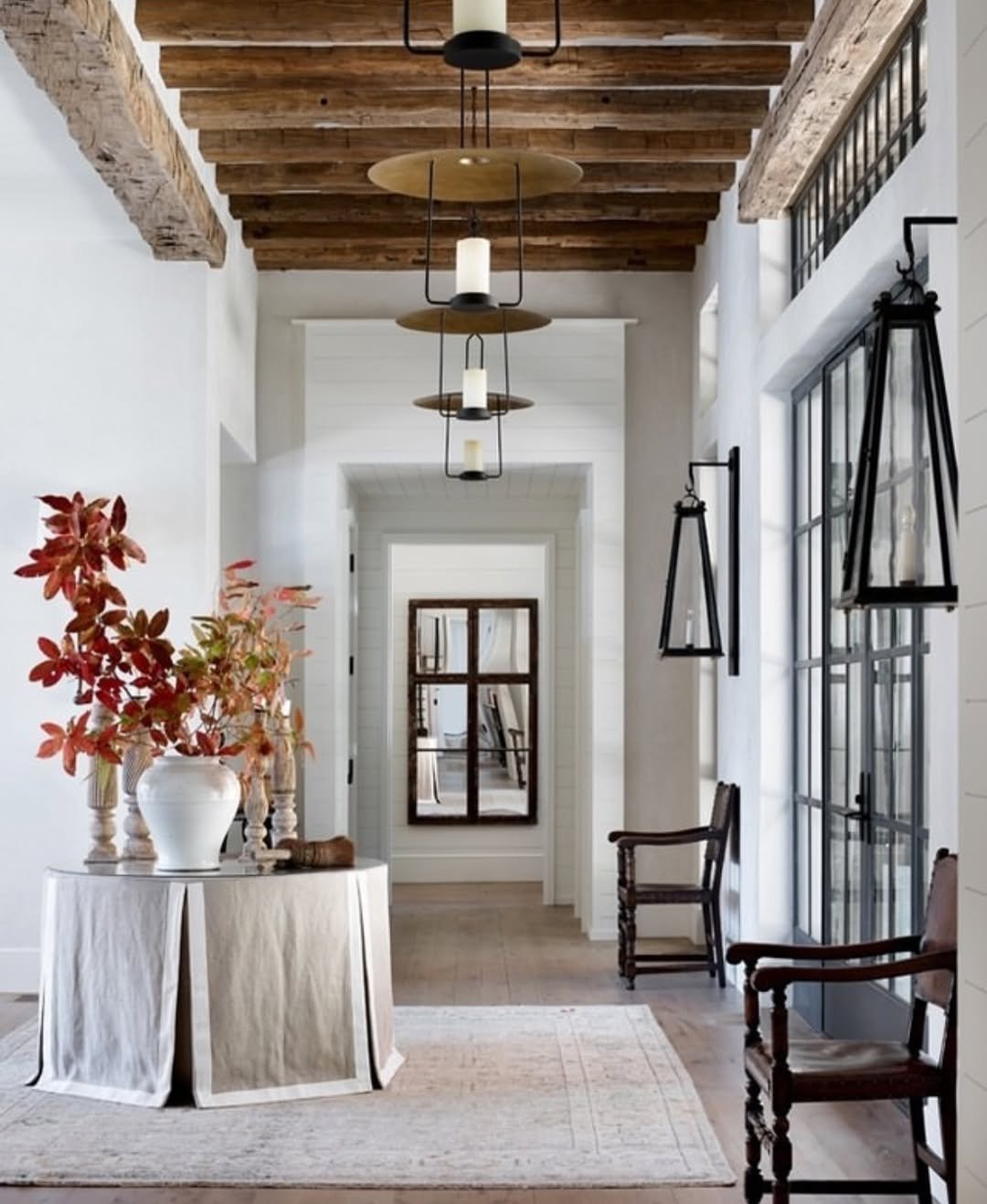 There’s a quiet drama in this hallway. The exposed beams, black-framed doors, and layered lighting give it structure, while the soft textiles keep it grounded.
