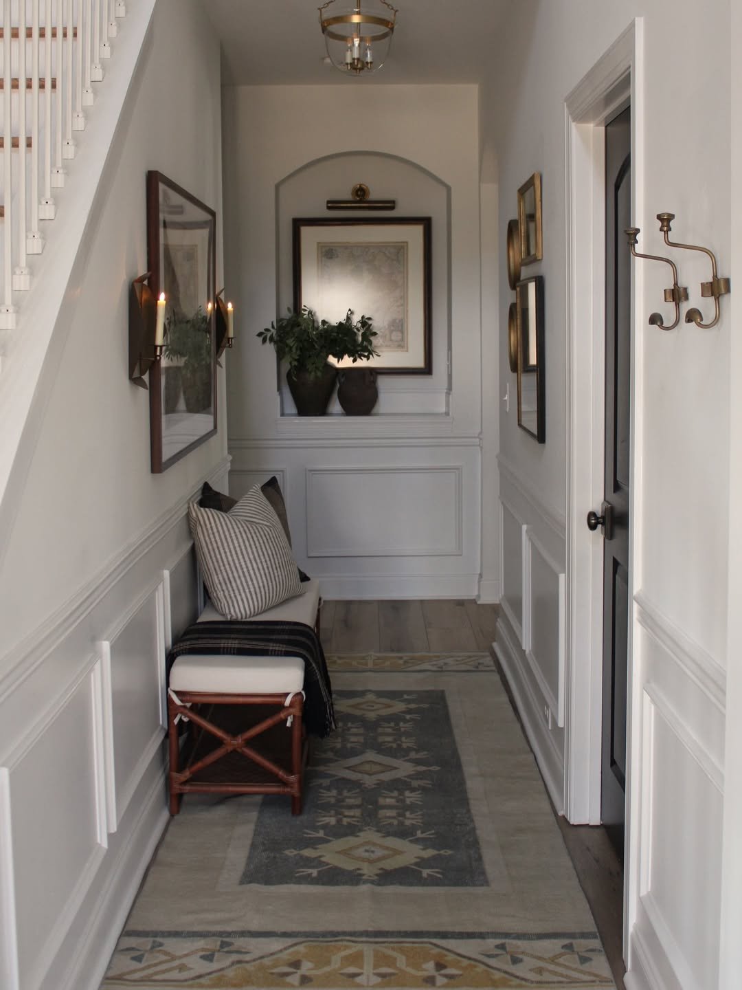 A slim entry like this could easily feel like an afterthought, but here it’s anything but. The paneled walls, soft runner, and that tucked-in bench create a quiet rhythm that draws you in rather than rushes you through.