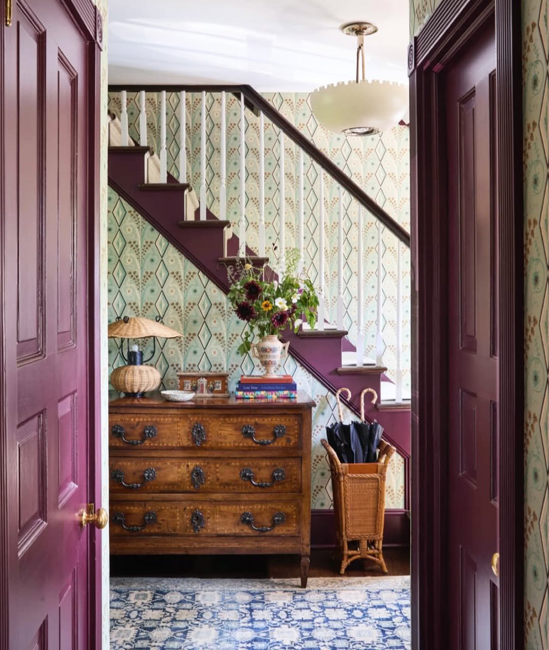 This one feels like stepping into a storybook. The wallpaper wraps the space in color and movement, while the deep plum staircase adds a richness you don’t see every day.