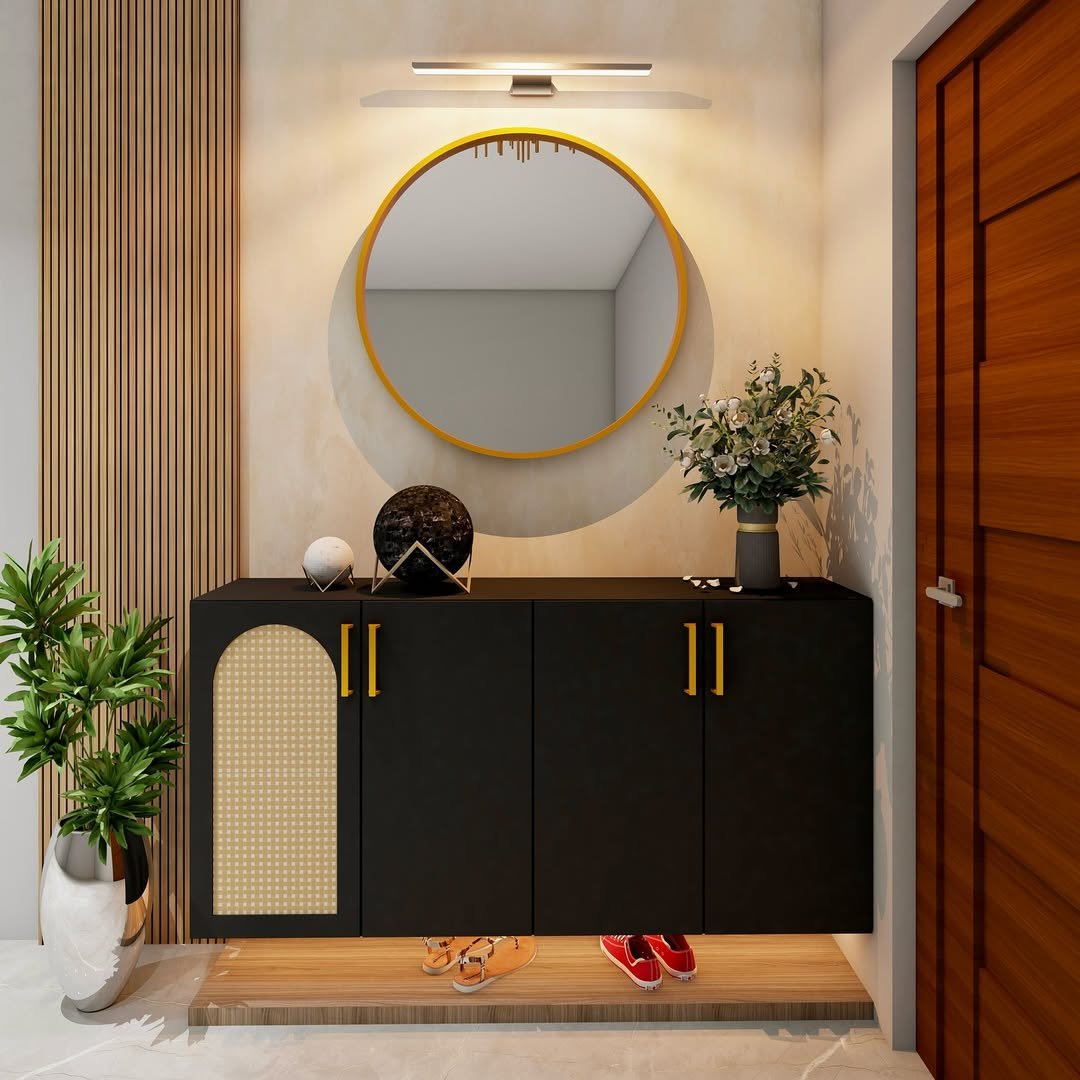 This entry is all about contrast and shape. The dark cabinet, warm wood accents, and that round mirror create a strong focal point the moment you walk in.