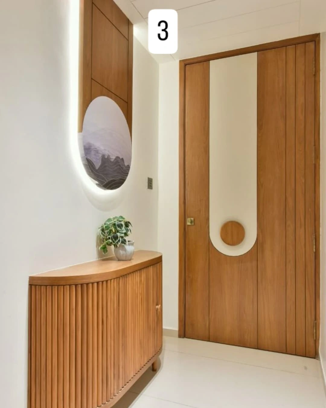 Clean lines take the lead here. The curved console, vertical wood door, and soft lighting create a space that feels almost gallery-like.