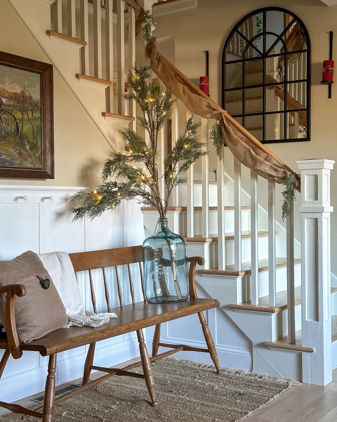 There’s something about this entry that feels like a deep exhale. The worn wood bench, the oversized glass jug with delicate branches, and that gentle glow of string lights create a moment that feels both seasonal and timeless.