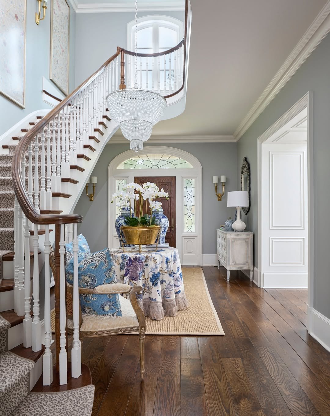 This is one of those foyers that feels dressed up, but still inviting. The curved staircase, soft gray walls, and that statement chandelier create a sense of occasion right at the door.