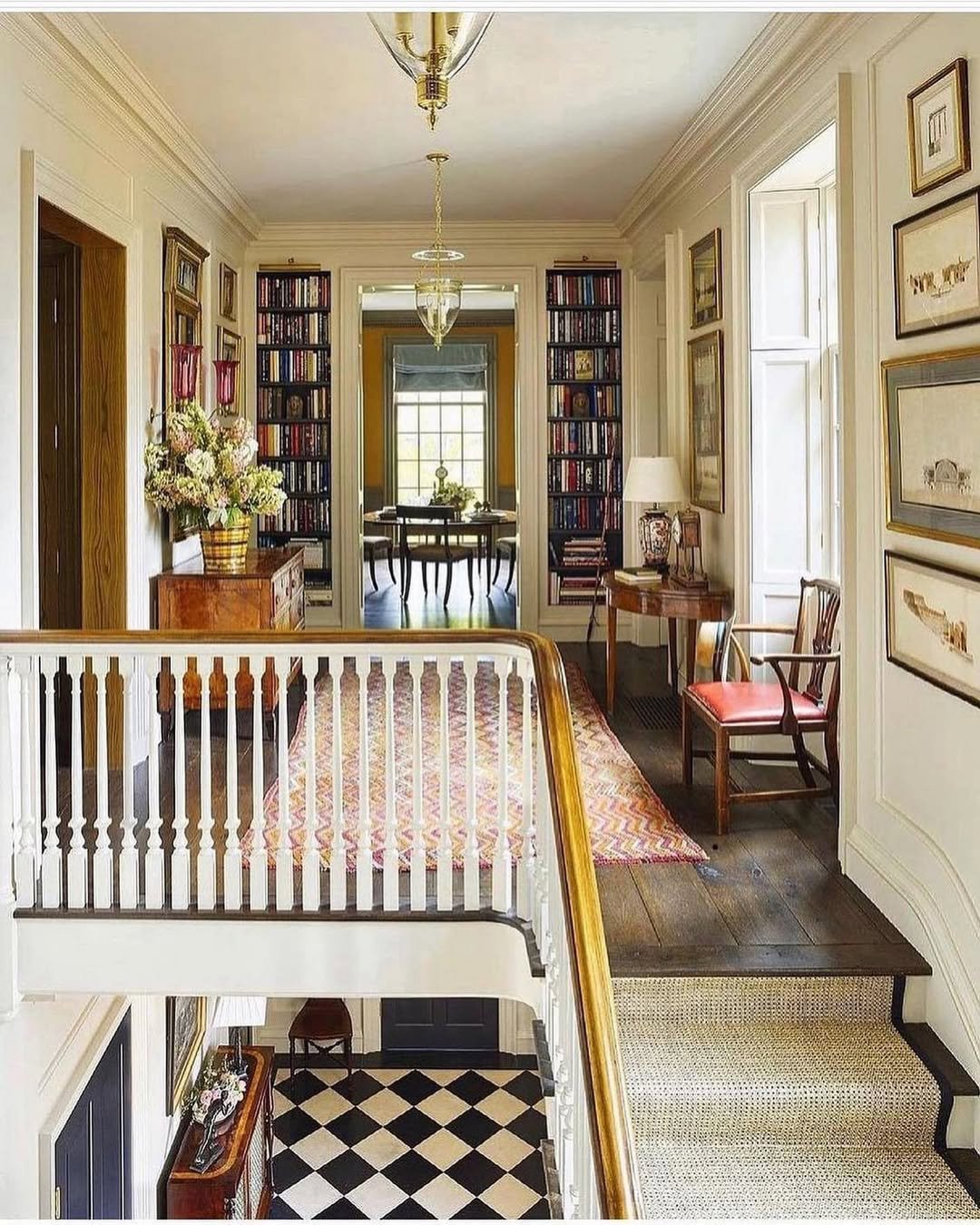 This one feels like a scene you want to linger in. Bookshelves frame the view, warm wood tones anchor the space, and the checkerboard floor below adds a touch of old-world drama.