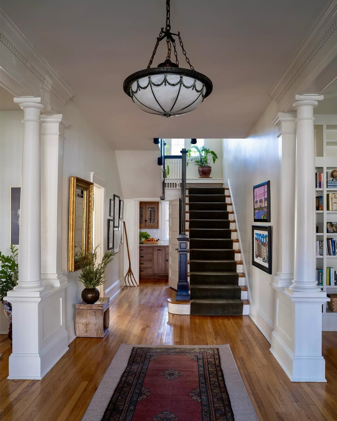 This entry unfolds slowly. Columns frame the space, the runner guides your eye forward, and that staircase draws you upward without overpowering the room.