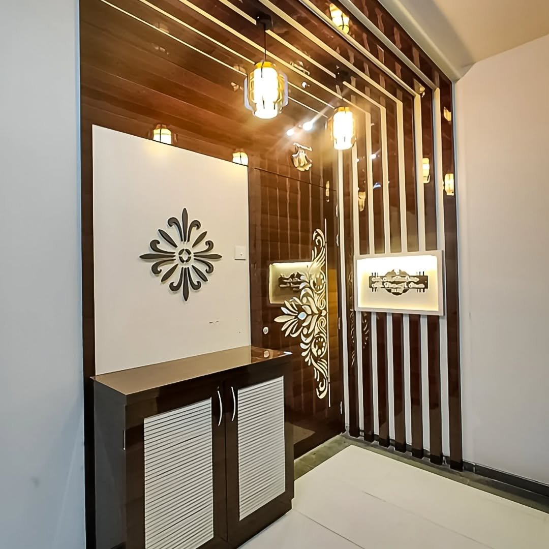 This foyer leans into a richer, moodier palette, and it works. The glossy wood paneling paired with soft backlit details creates a layered entrance that feels both modern and rooted in craftsmanship.