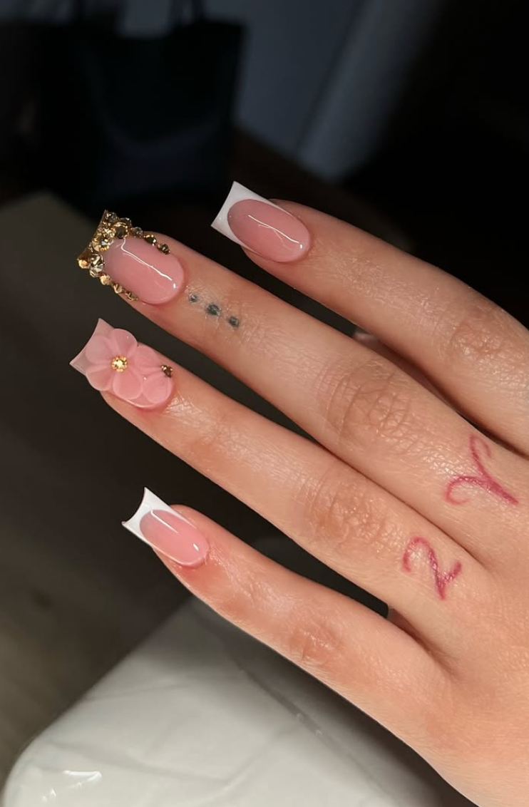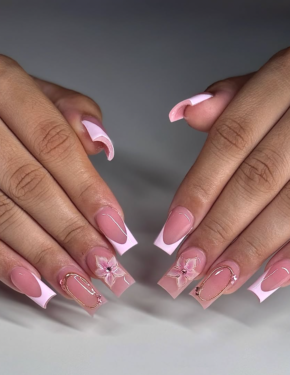 This pink French by @nailzbymarlene_ feels like a little work of art—each nail carefully dressed with blush-toned flowers and delicate gold outlining. The soft square shape keeps it modern, while the floral accents add a sweet, handcrafted charm.