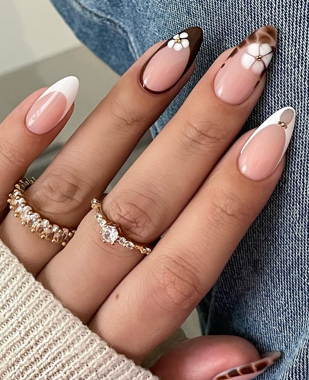 @ nailzkatkat turns the classic French into a little garden moment with chocolate-toned tips and tiny daisy accents. The mix of brown, white, and soft nude feels earthy and warm—like a cozy autumn palette, but with a flirty twist.