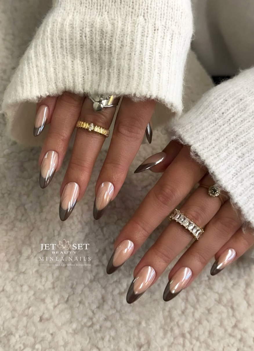 This final look from @minea.nails gives us a modern metallic moment — the French tip reimagined with smoky chrome that creates a soft mirror finish. Paired with a sheer nude base, the effect is chic, cool, and surprisingly understated.