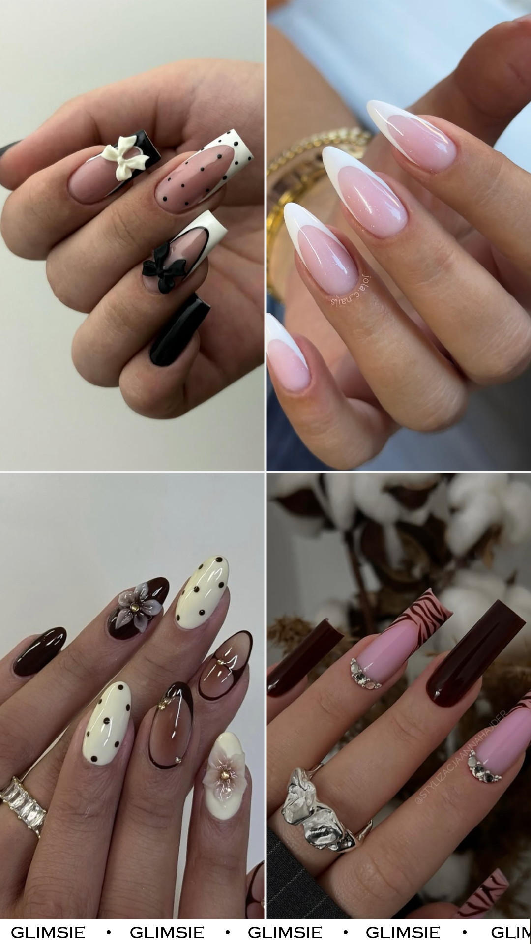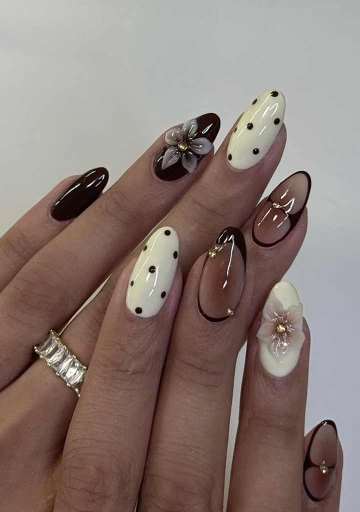 This set from @prettywth.julia has such a fun, retro vibe. Creamy French bases meet chocolate dots and sculpted florals, giving the whole look a vintage dessert-inspired charm. It’s like a mix of old-school glamour and modern nail art precision.