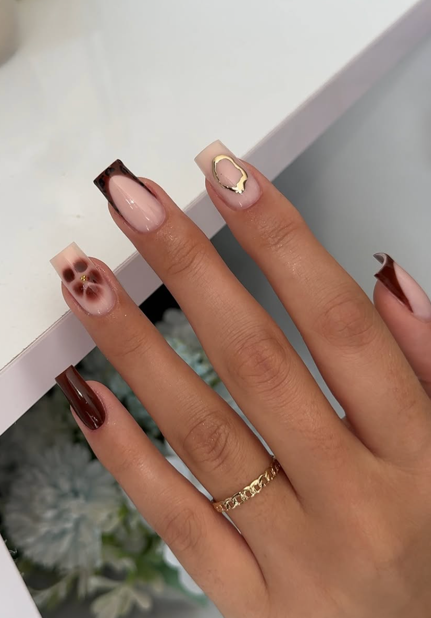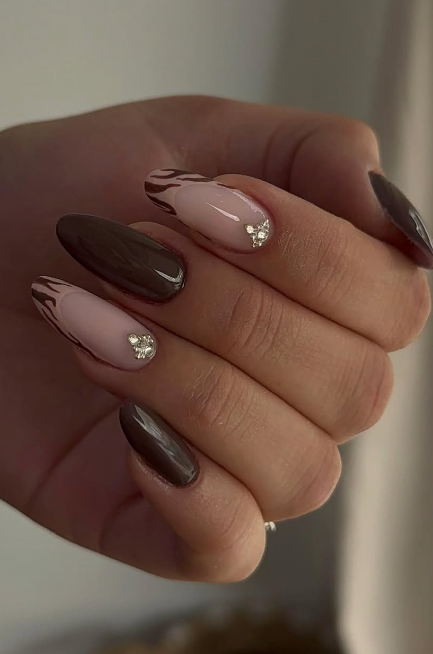 This mani from @ac.studio87 leans into warm café tones — creamy nude, espresso brown, and a whisper of abstract detailing that keeps it playful. The tiny gems tucked near the cuticle add a little sparkle without ever stealing the show.