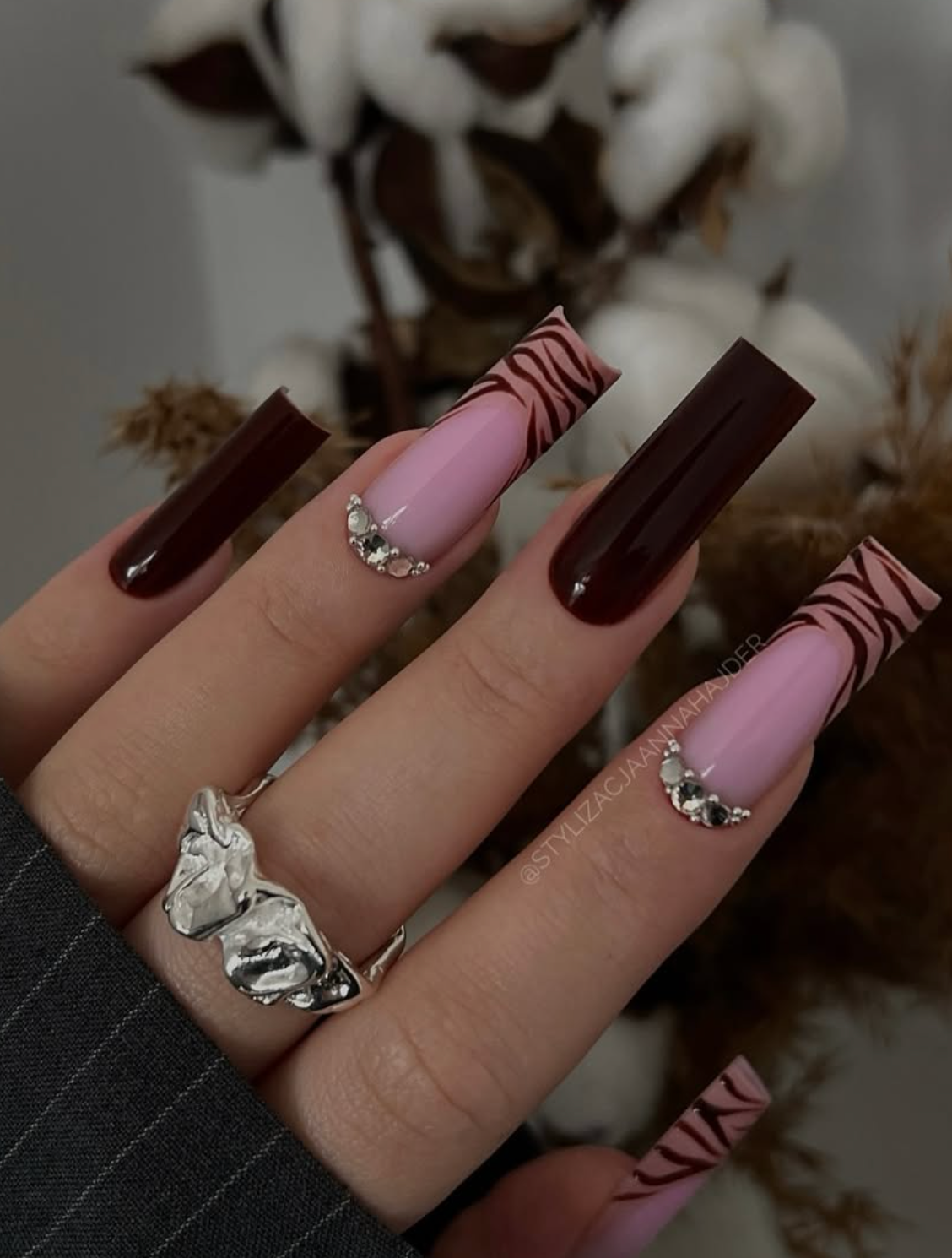 There’s a moody, runway-chic energy to this set from @stylizacjaannahajder — the kind that makes you want to wear an oversized blazer, sip something warm, and pretend you’re stepping out of a fashion house. The deep mocha tips feel rich and velvety, perfectly contrasted by that soft blush base. And then comes the zebra-striped French… bold, graphic, and still somehow incredibly elegant.