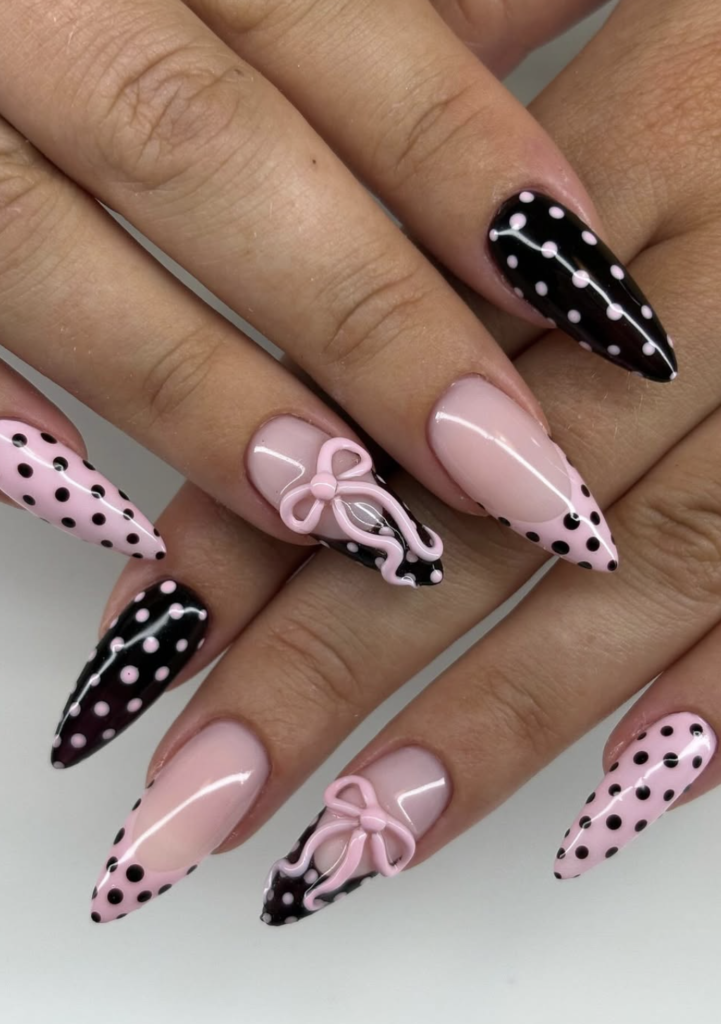 For the grand finale of this batch, @sevenailz delivers a bold, high-contrast French bursting with personality. The alternating black and pink dotted tips feel retro and fun, while the sculpted bows give it an irresistibly girly twist.
