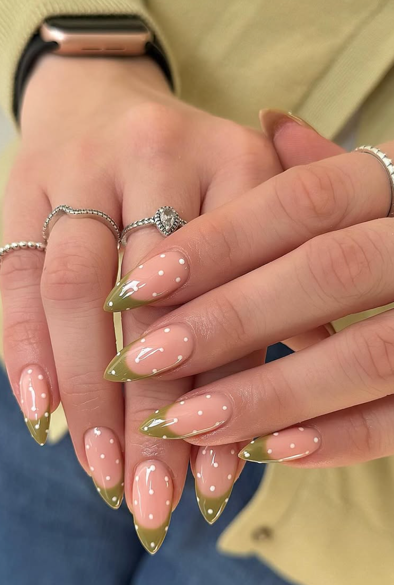 There’s something so charming about this olive-tipped French from @nailsbynatashapaige. It has that playful, springtime sweetness—soft polka dots, glossy green edges—that instantly lifts your mood.