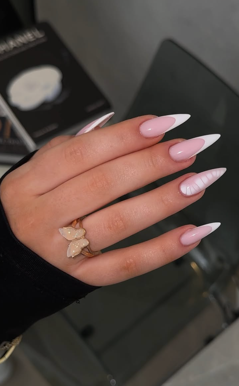 @iliriananails_ does stiletto French tips in the most graceful way — elongated, crisp, and impossibly glossy. The white tips taper to a perfect point, giving the nails a sculpted, almost ballerina-like energy.
