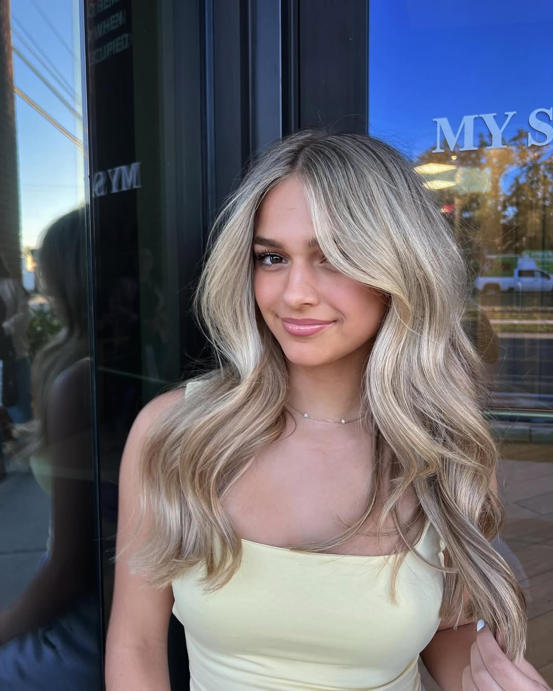This look screams spring sunlight. Long, blended layers paired with a bright, airy blonde that moves so naturally. It feels fresh, open, and full of glow.