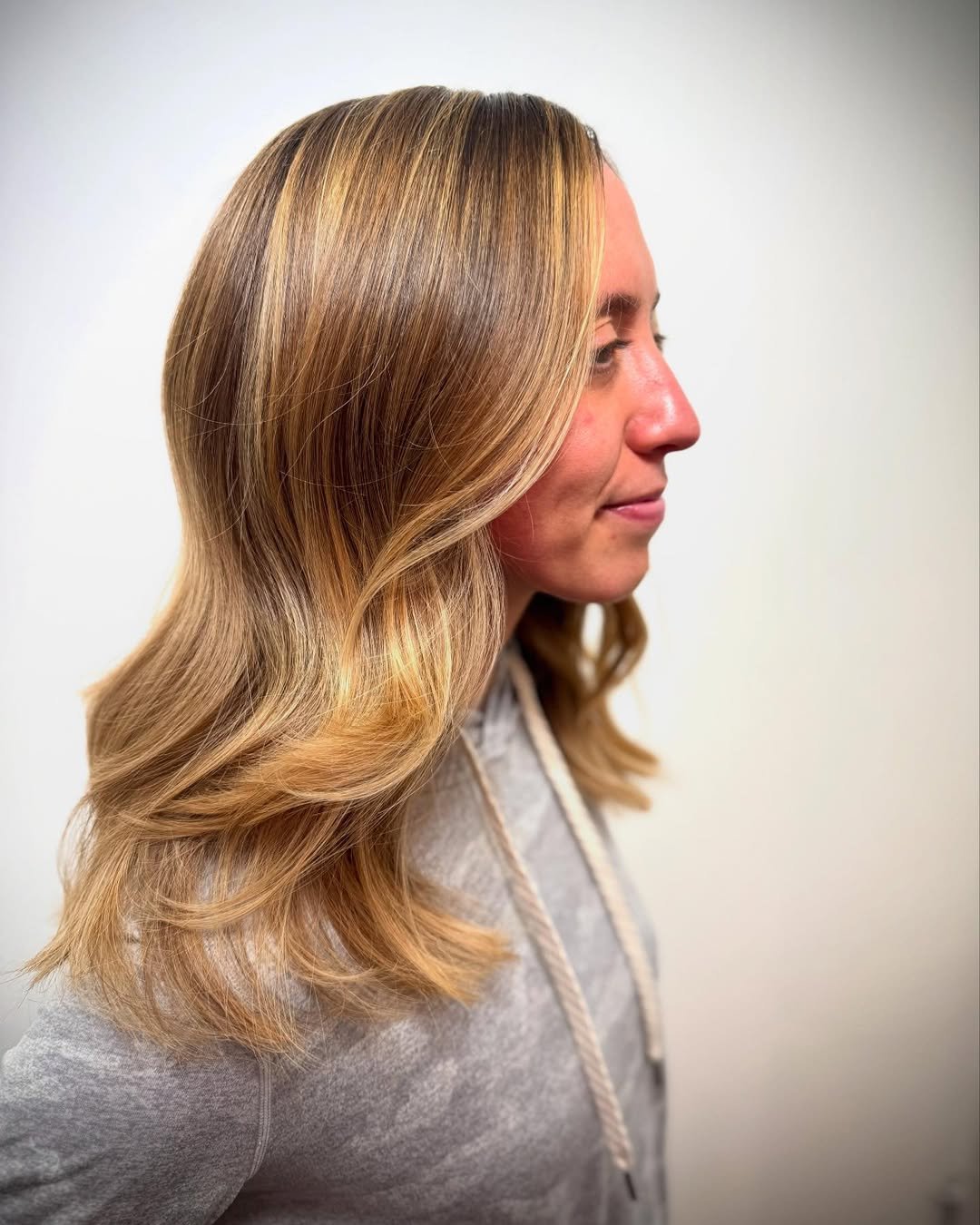This is soft glamour done right. Long layers with that airy, bouncy finish that gives volume without feeling heavy. It has that fresh-blowout energy but still looks touchable and relaxed.