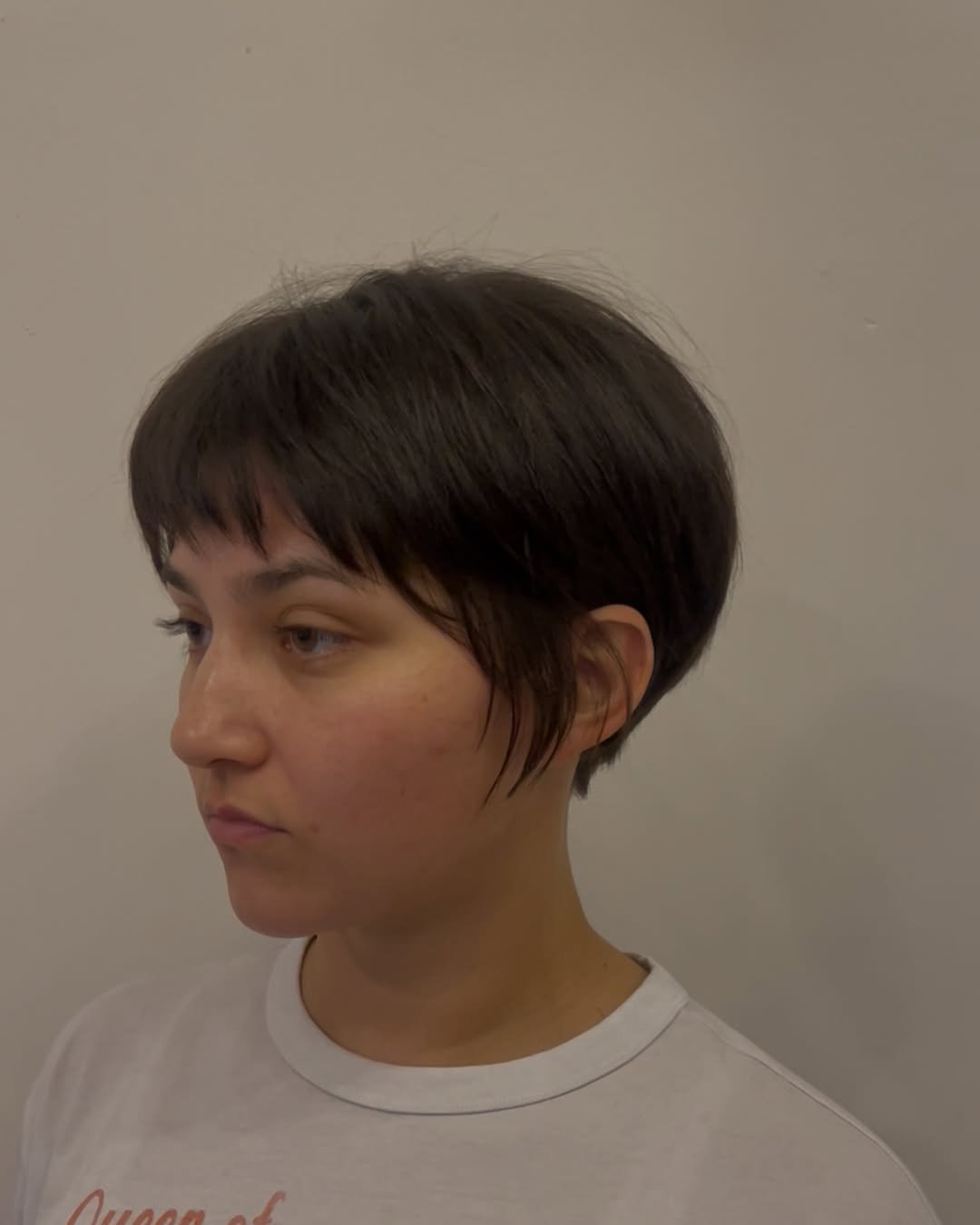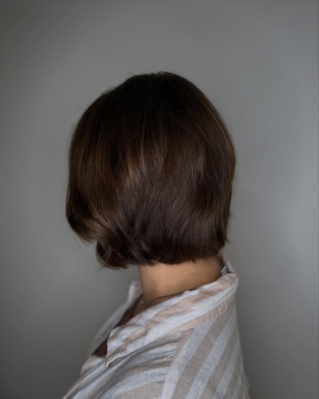 Short, sharp, and full of personality. This micro bob is clean at the ends with just enough curve to keep it playful. It feels chic in that “I didn’t overthink this” way.
