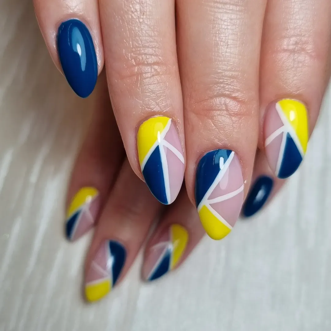 This design uses bold color blocking in the most satisfying way. Deep navy, bright lemon yellow, and soft blush tones meet at sharp angles across each nail, separated by thin white lines.