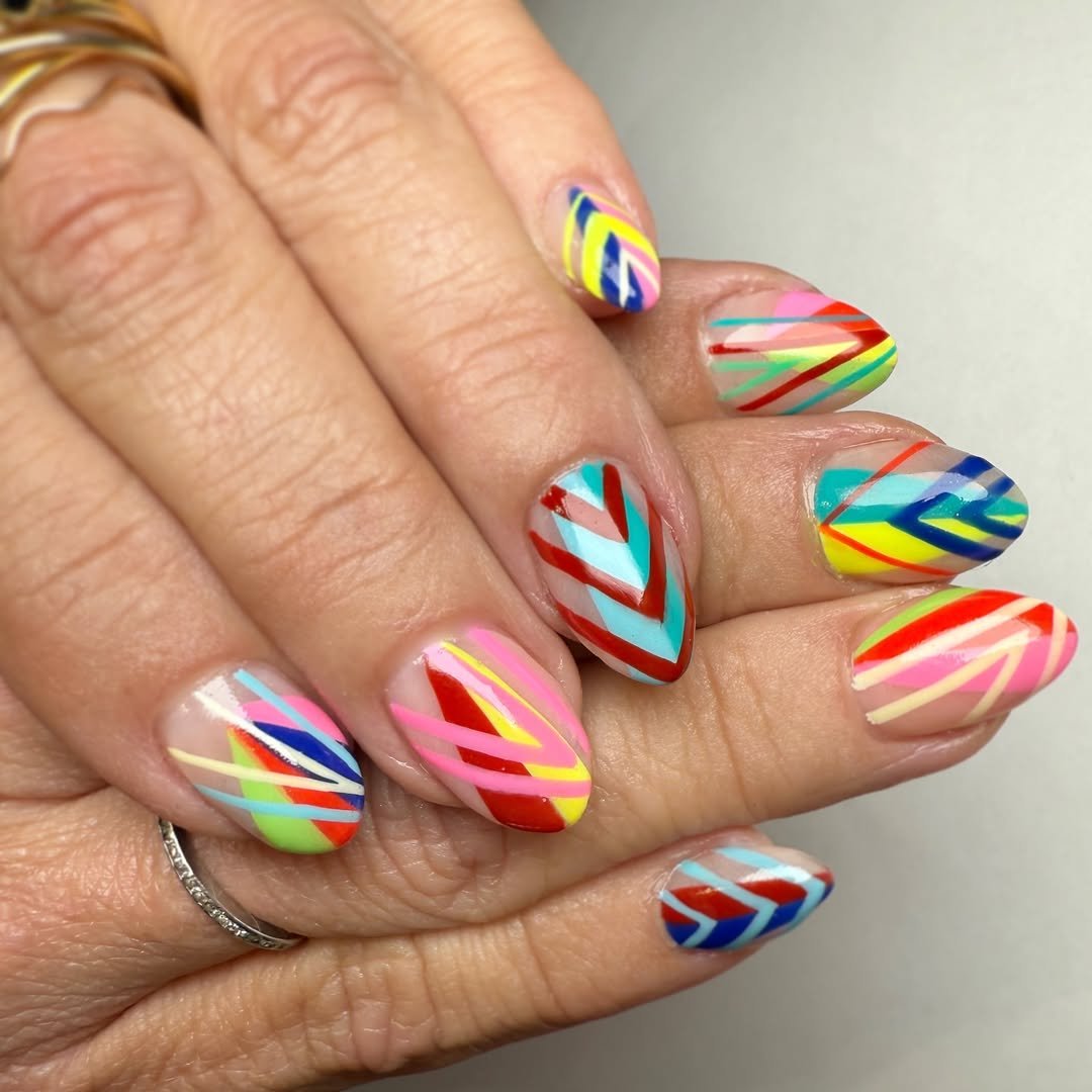 Every nail has its own little moment, but the repeating angles and stripes tie everything together beautifully. It’s loud, colorful, and unapologetically fun—the kind of manicure that instantly boosts your mood.