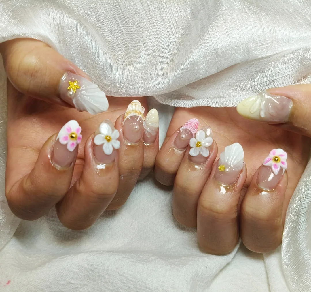 These nails are pure delicate fantasy. Soft translucent bases with raised white flowers, shell textures, and tiny gold studs that add just enough sparkle.