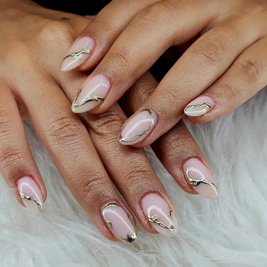 Soft blush pink with delicate gold veining running through each nail—like subtle marble but more fluid and organic.