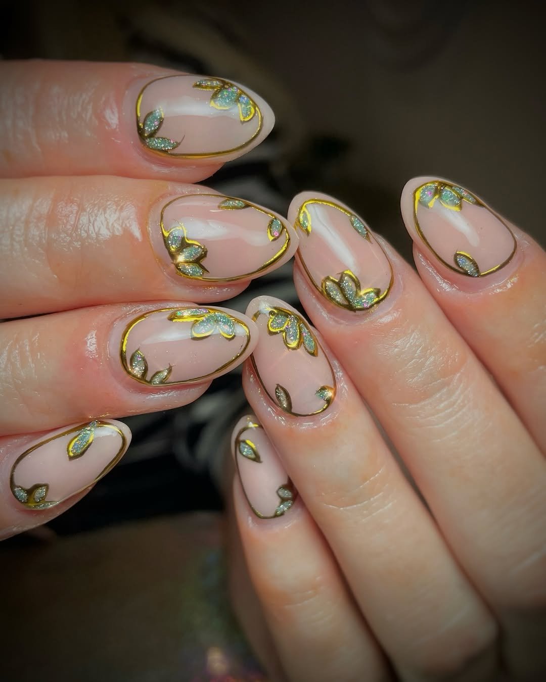 These nails feel like delicate pressed flowers framed in gold. A sheer blush base outlined in metallic gold, with iridescent leafy accents that catch the light just right.