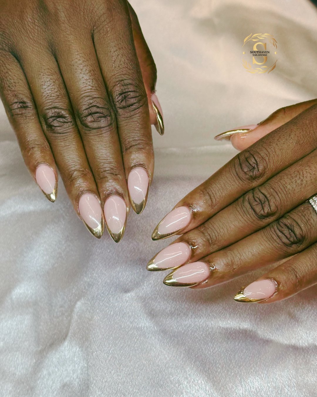 Soft blush pink and razor-sharp metallic gold tips? That’s timeless with an edge. The elongated almond shape makes the gold pop even more.