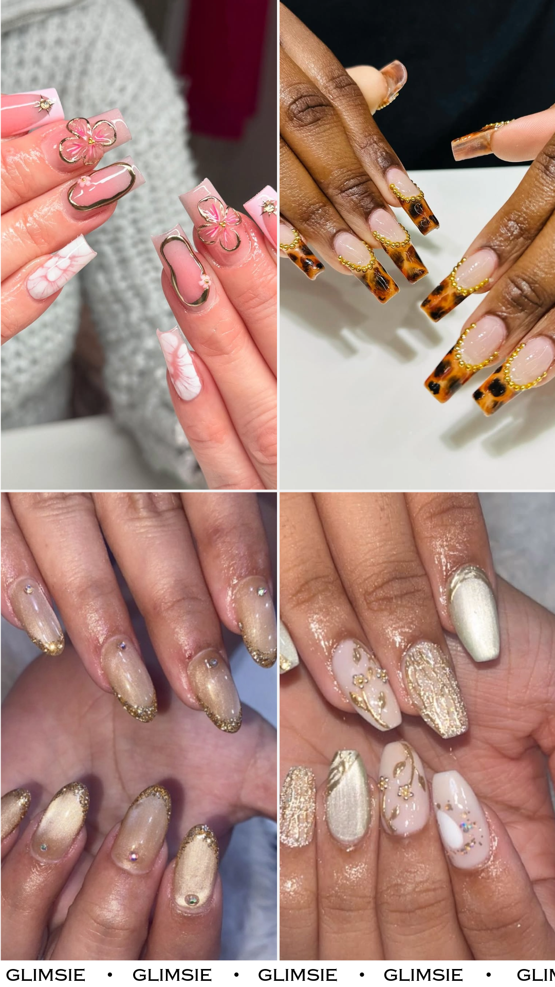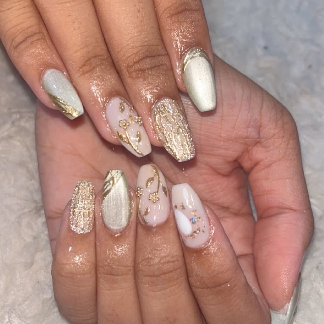 Each nail has its own personality, but the gold ties everything together beautifully. It’s soft glam with dimension, like layering jewelry but for your hands.
