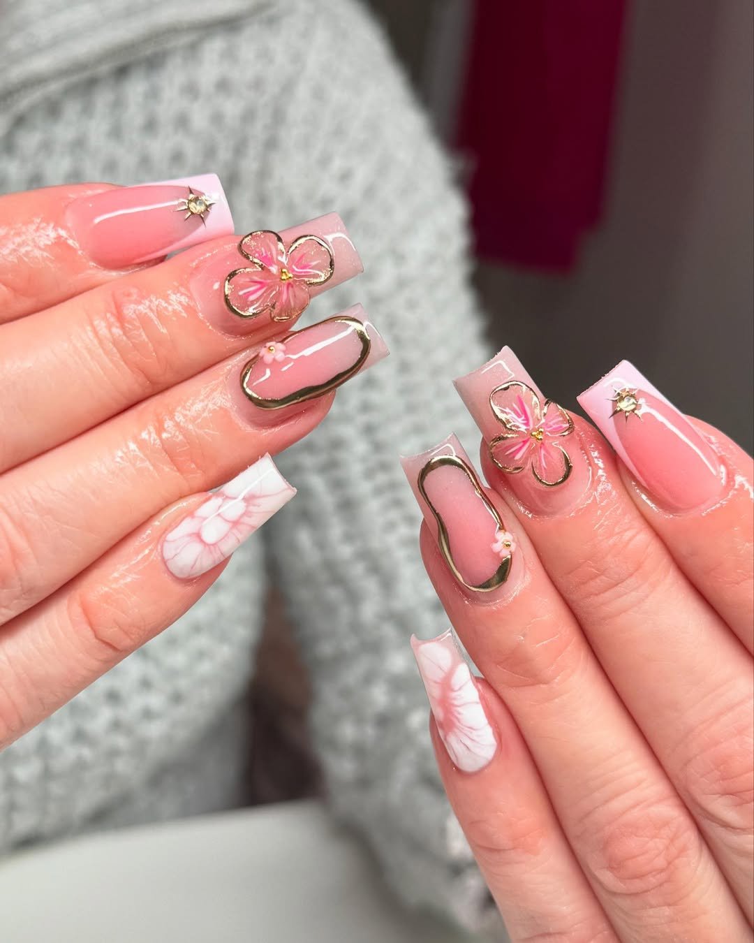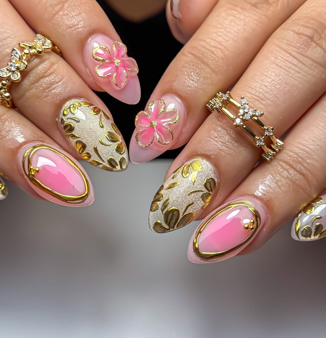 These nails feel like a luxe spring garden dipped in gold. Soft blush tones meet raised pink florals, while the accent nails shimmer with textured gold leaf detailing.