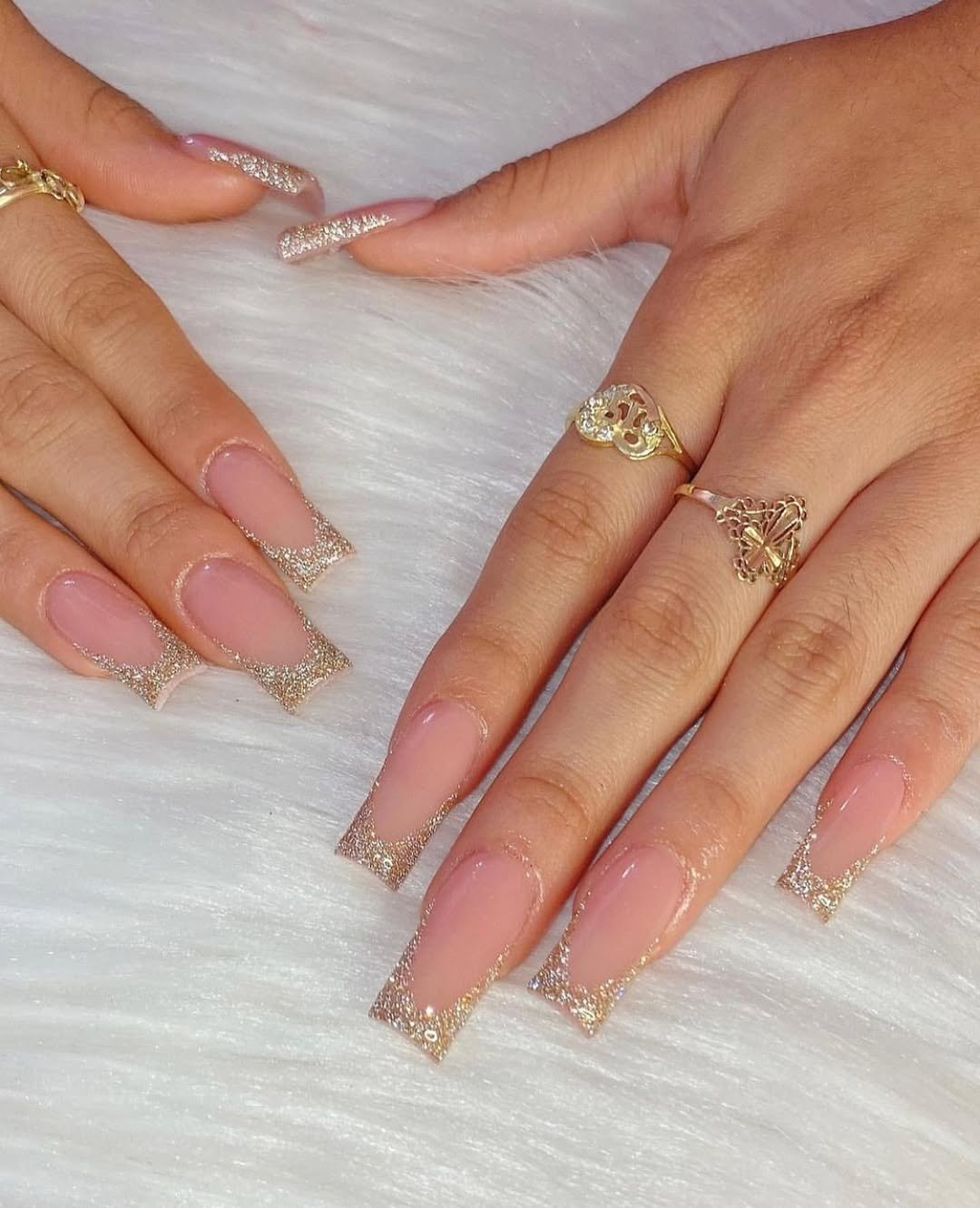 This is the kind of set that whispers elegance. A sheer blush base with soft champagne glitter fading in at the tips—no harsh lines, just smooth sparkle.