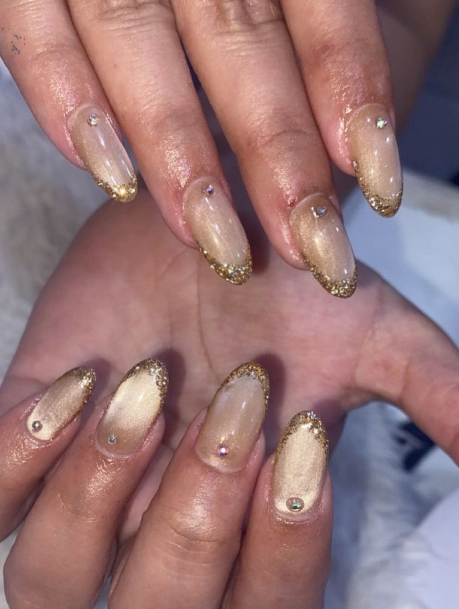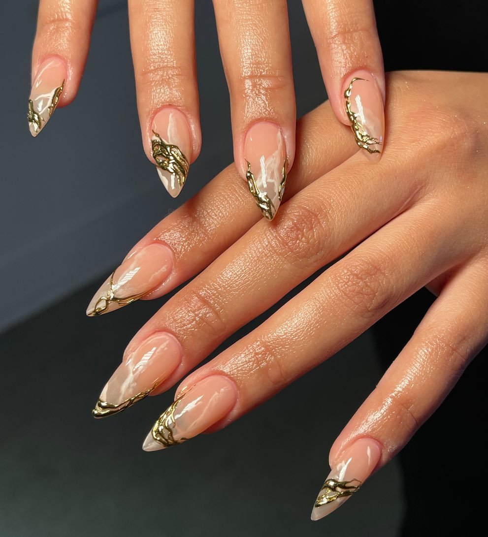 Classic nude almond nails—but those gold-tipped edges look like molten metal dripping perfectly along the tips.