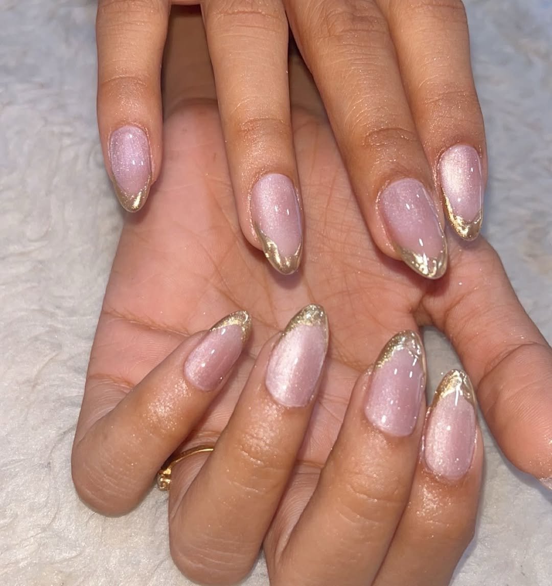 A milky pink base with subtle gold French tips that curve naturally along the nail shape—this one is all about refined shine.