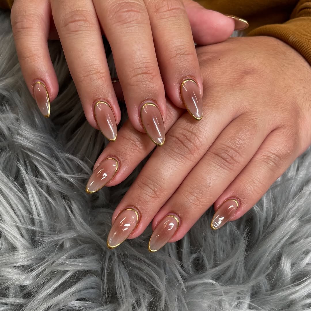 This is that “clean girl but make it luxe” manicure. A glossy caramel-nude base wrapped in the thinnest molten gold outline that hugs every curve of the almond shape.