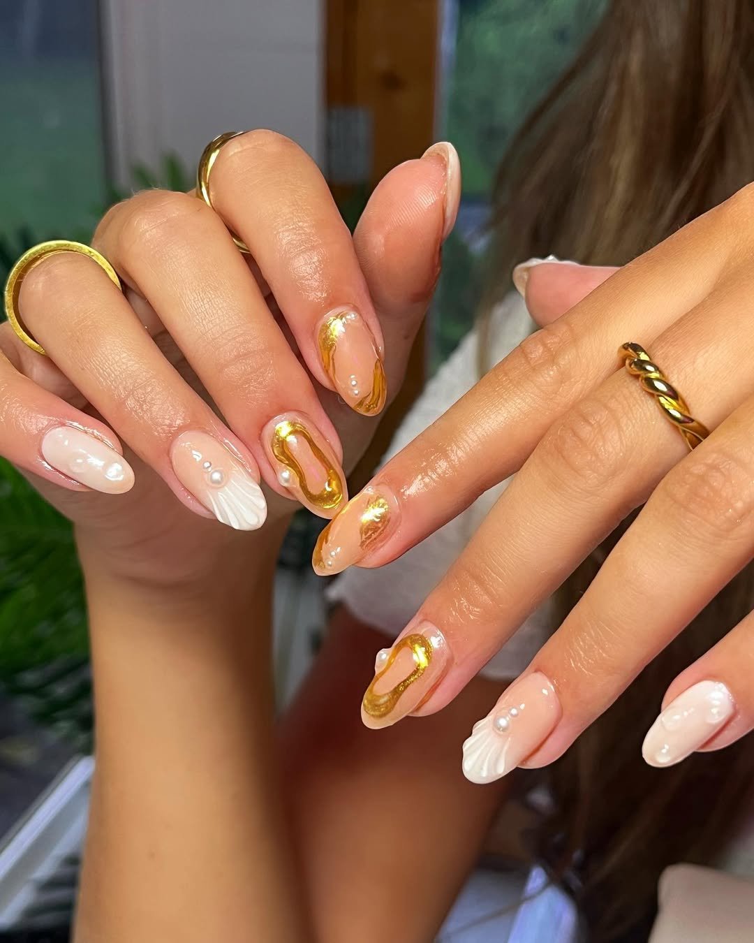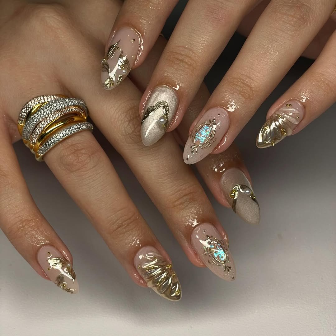 Okay but this set is doing the most—in the best way. Creamy nude tones meet raised shell textures, soft pearls, and bold liquid-gold accents that almost look poured on.