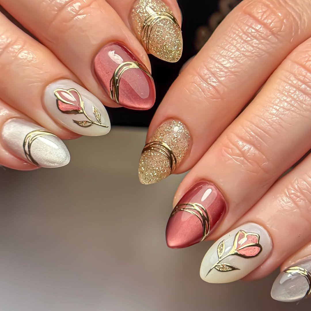This set plays with contrast so beautifully. Soft dusty rose, creamy ivory, and full glitter gold nails—all tied together with delicate gold line accents and a floral detail.