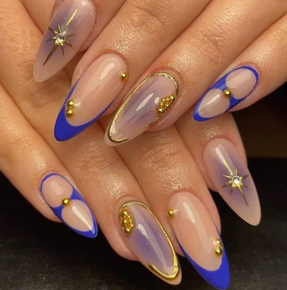 That electric blue French tip against a soft nude base is already a moment—but then you add gold studs, starbursts, and delicate metallic outlines? Next level.