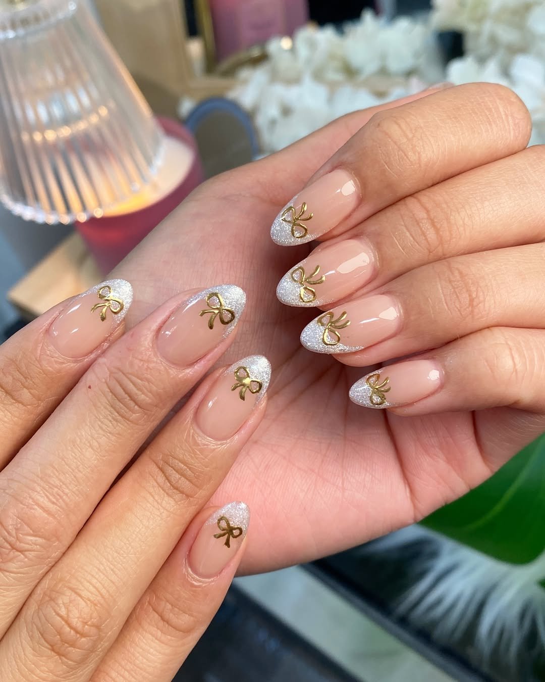 A soft nude base with icy silver glitter tips and tiny gold bow accents? Clean, sweet, and quietly luxe.
