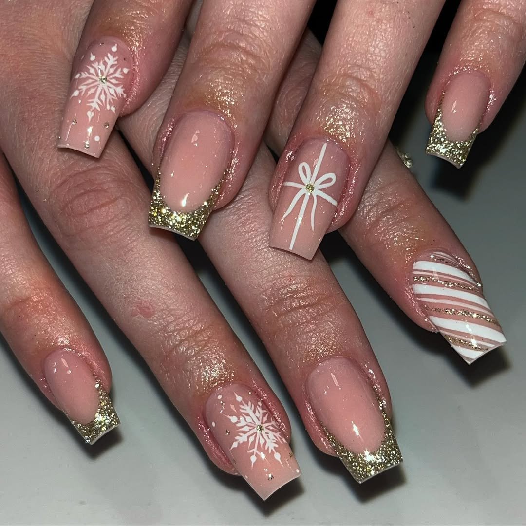 These nude-pink nails with glittery gold French tips are already festive—but those white snowflake accents? Instant winter magic.