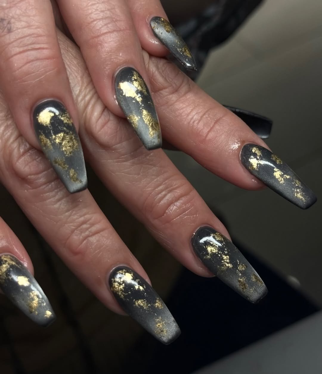 Dark, moody charcoal nails with scattered gold foil? This set is pure contrast magic. The matte black base makes the gold flecks pop like constellations.